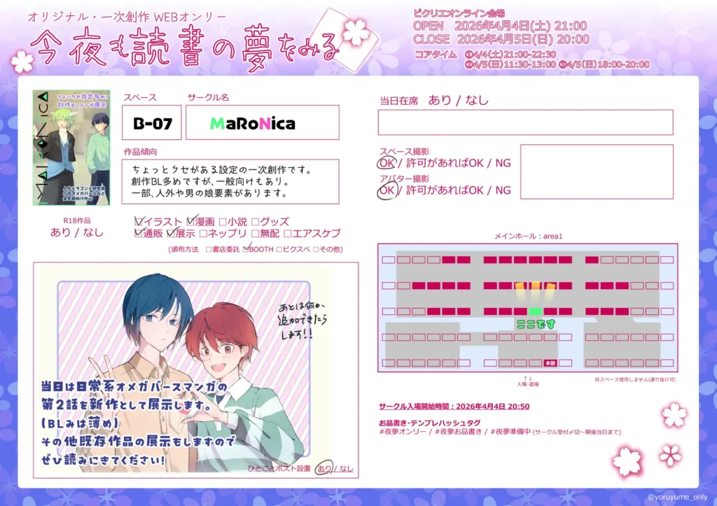 ピクリエにて開催されます「オリジナル・一次創作 WEBオンリー『今夜も読書の夢をみる』」に参加します。