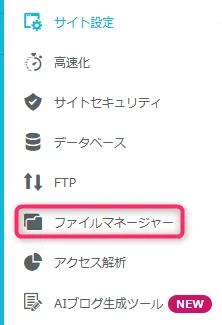 私が利用しているレンタルサーバー「ConoHa Wing」では、「ファイルマネージャー」というWEB画面上でファイルのアップロード等を行える機能があります。