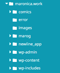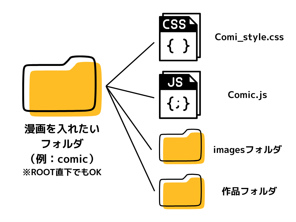 例えばROOT直下、上記画像には「Comics」など様々なフォルダがありますが、直接「maronica.work」フォルダに先程の画像に記載されている「Comi_style.css」および「Comic.js」、ビューア用の画像が入った「images」フォルダ、そして画像とindex.htmlが入った「Yamadakun」フォルダ(先程の画像でいう「作品フォルダ」)をアップロードします。
