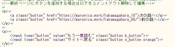 上記画像の中に<!–最終ページにボタンを追加する場合は以下をコメントアウト解除して編集–>とあるように、初期では画像2行目(改行マークのみ入っているところ)に「<!–」、7行目、</p>と<p>の間の改行マークのみ入っているところに「–!>」が入っています。
