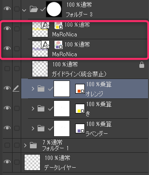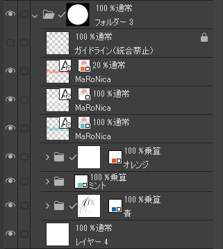 白抜きのためのレイヤー(通常)と蛍光オレンジレイヤー(通常)を、一番上に配置して統合しました。